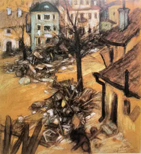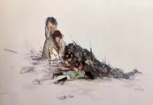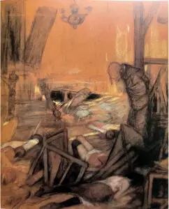 ויש כאן גם רישום אחד, שאבל פן צייר את הזוועות של מלחמת העולם הראשונה, בה רואים את הגרמנים משתמשים במגן אנושי בילדים ונשים.