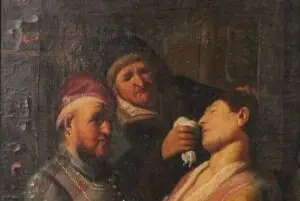 הציור שגודלו – 10*12.5 אינץ', תואר ע"י בית המכירות כדלקמן : אסכולה קונטיננטלית, המאה ה-19, כנראה לא חתום, הקונים הפוטנציאלים מתבקשים לשים לב שלציור  יש חוסרים (נפילות צבע),תיקונים ישנים, סדקים בלוח העץ. הציור מתאר אישה צעירה,  מעולפת עם מטפחת אף, כנראה עם מלחי הרחה, שמוחזקת קרוב לאפה ע"י דמות מבוגרת  בעוד שגבר (כנראה בעלה) מסתכל במחזה.