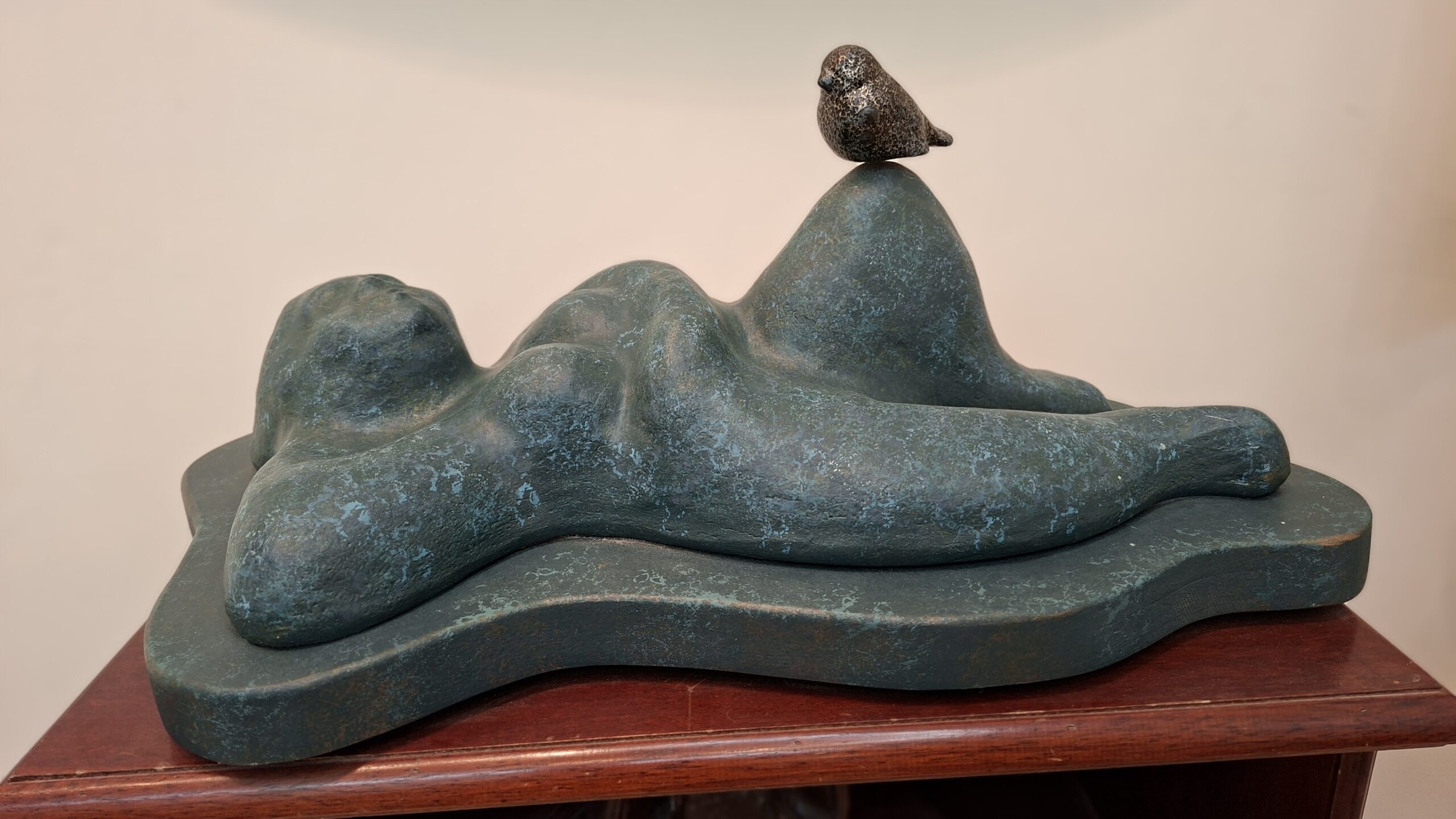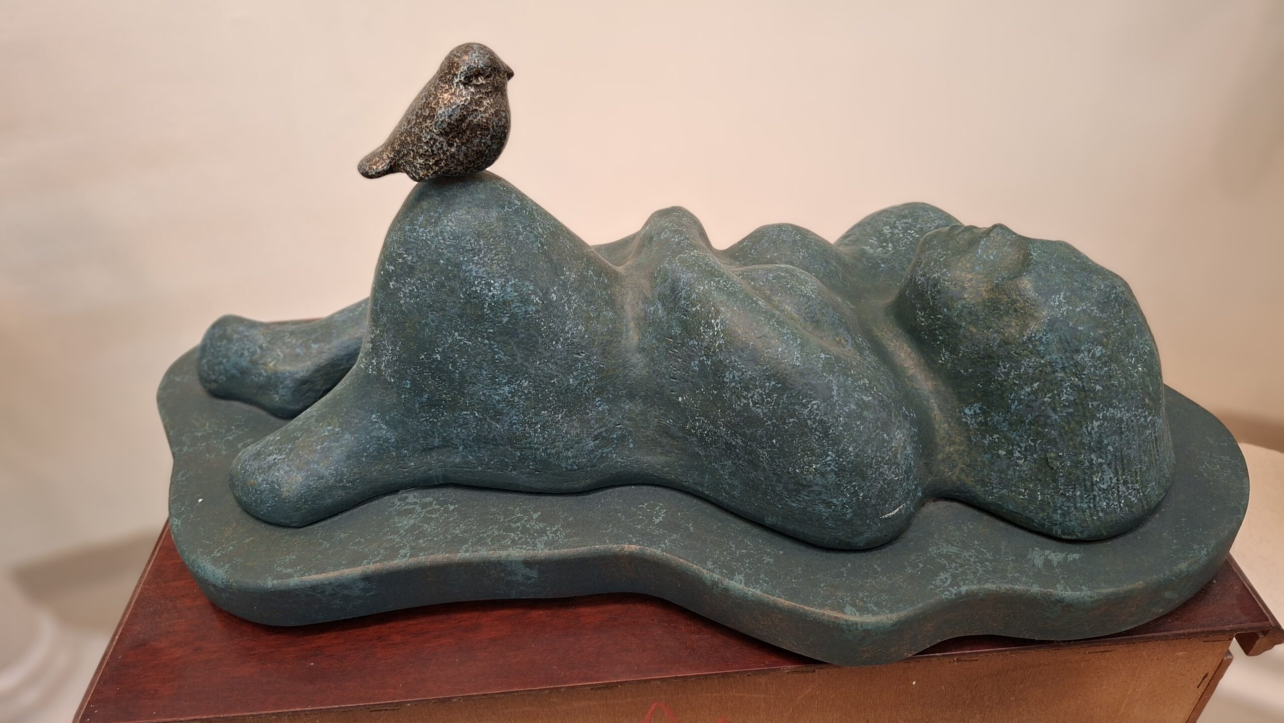 פסל רומנטי -חושני, של נערה, שוכבת אפרקדן וציפור נחה על ברכה. פסל מאבן יצוקה , חיפוי דמוי ברונזה.
