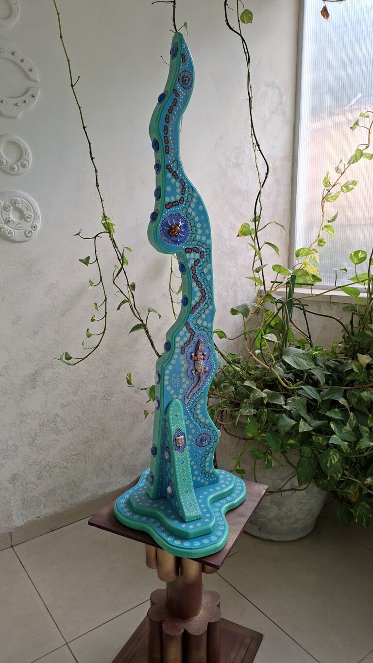 הפסל שואב השראה ממאפייני האמנות האבוריג’ינית – שפת הנקודות, הצבעוניות העזה, והקשרים הסמליים שבין טבע, אדם ורוח. עם זאת, הוא נושא חותם אישי מובהק, המבקש לגשר בין יצירה קדומה לראיה וחזון עכשווי.