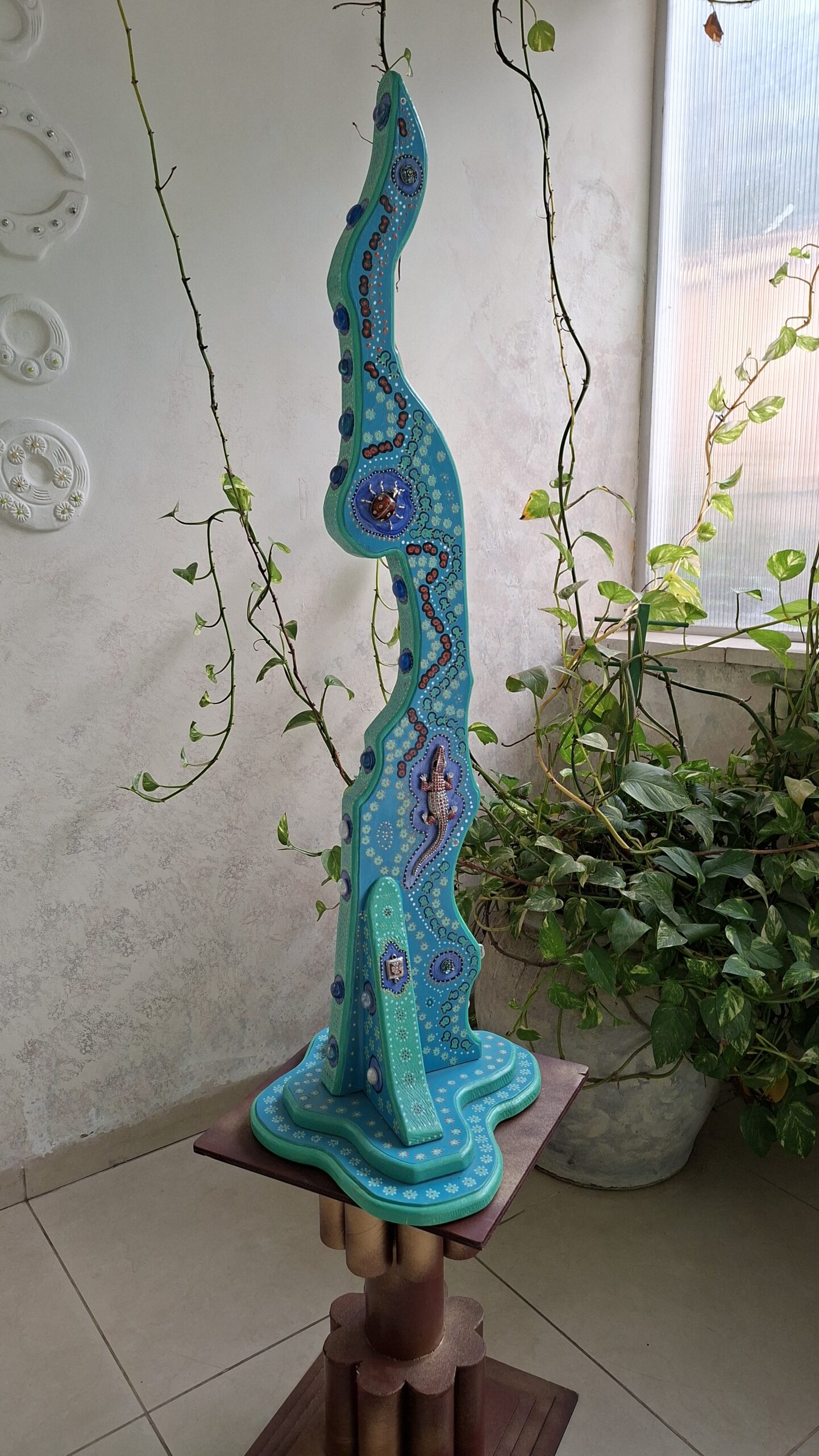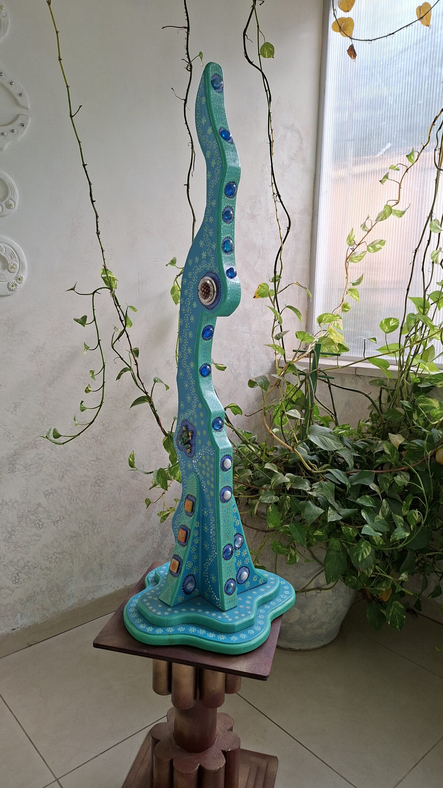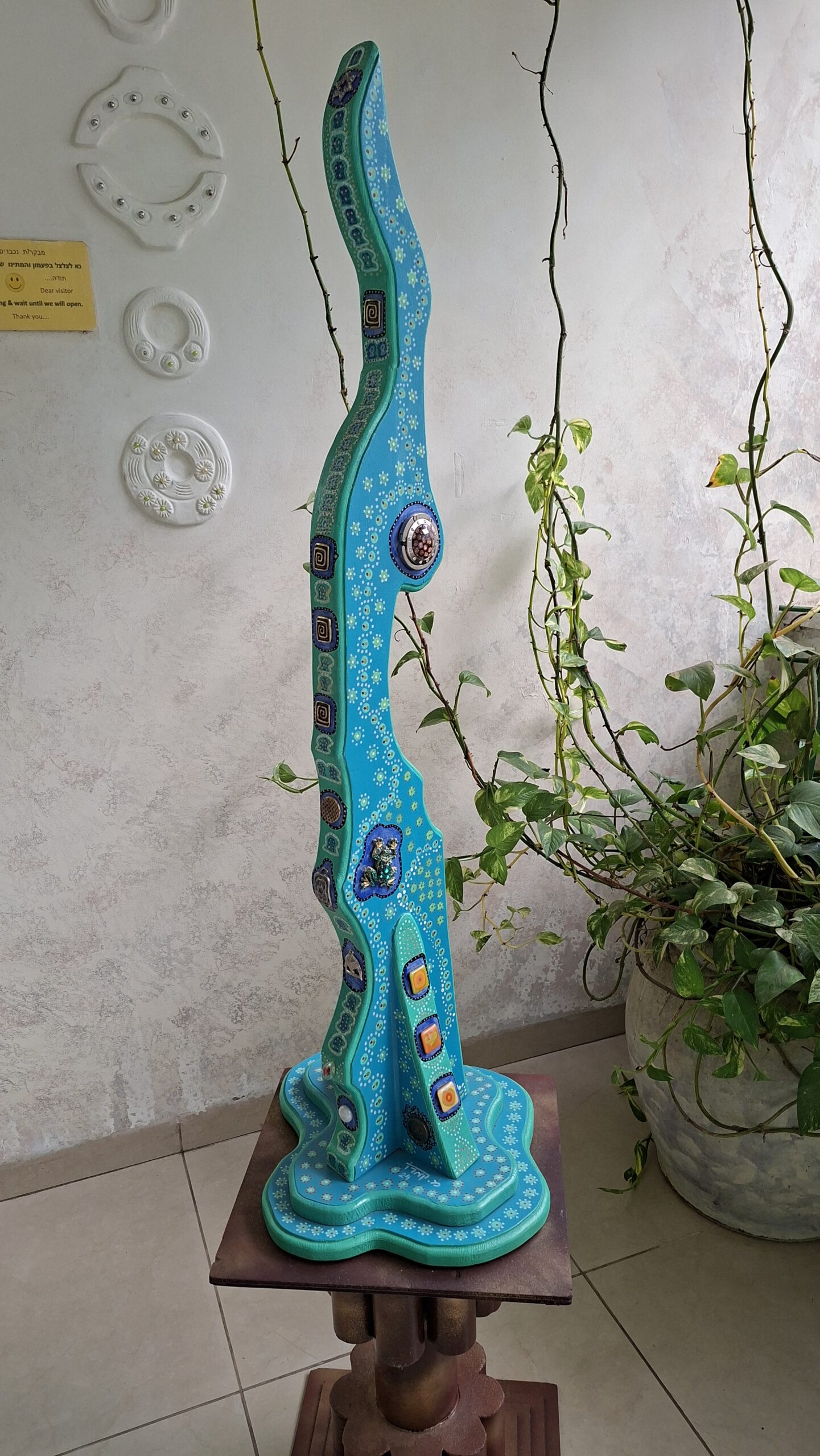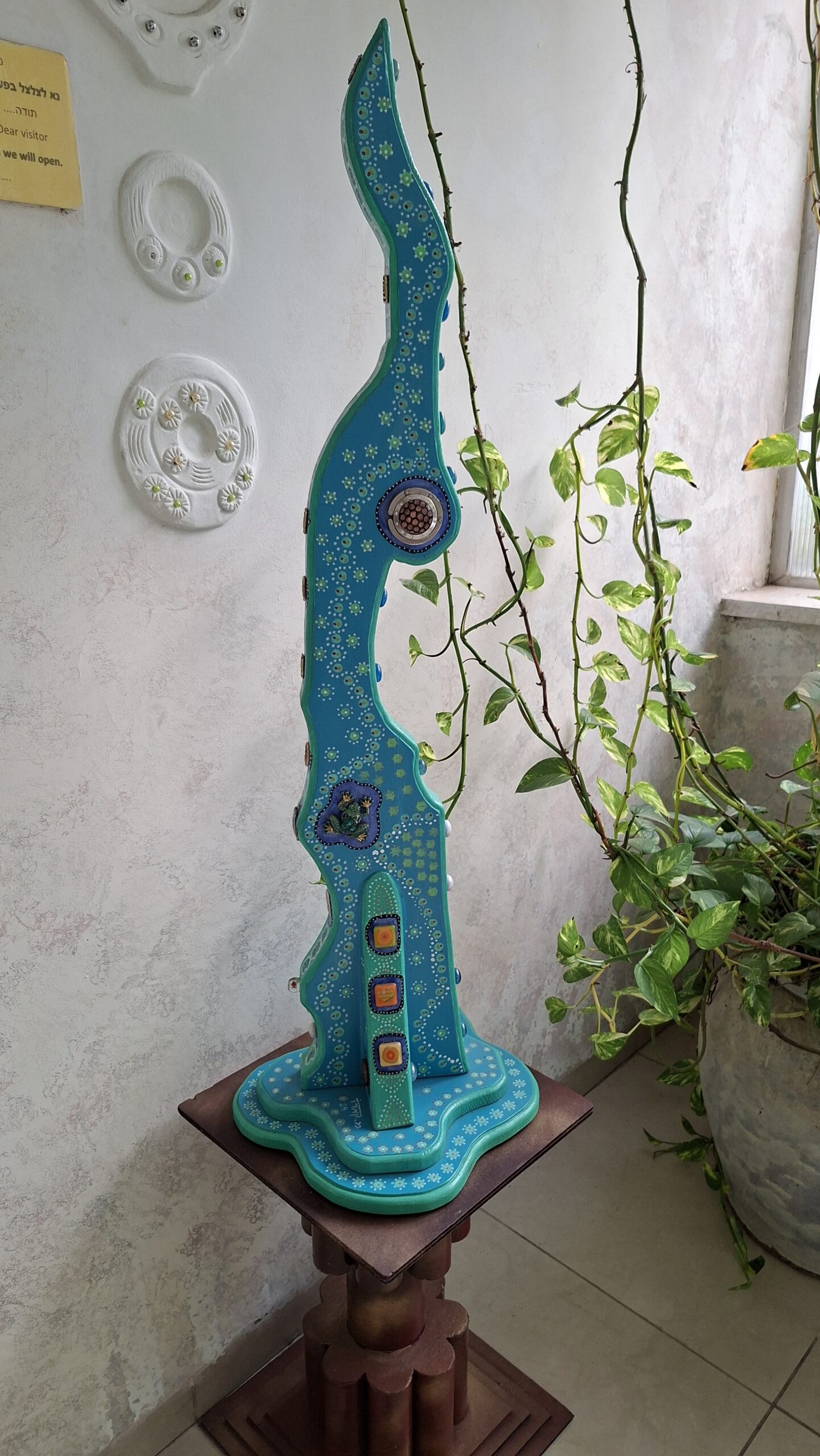פסל מעץ אורן, צבעי אקריליק, found objects (פריטים מוכנים)