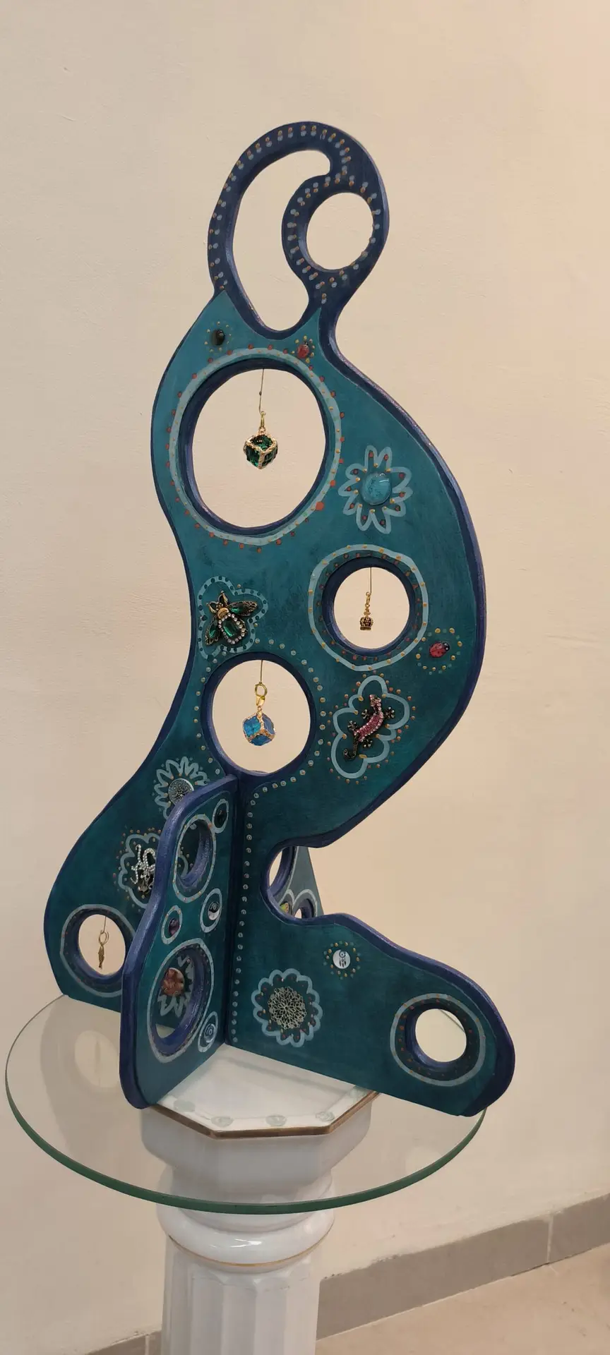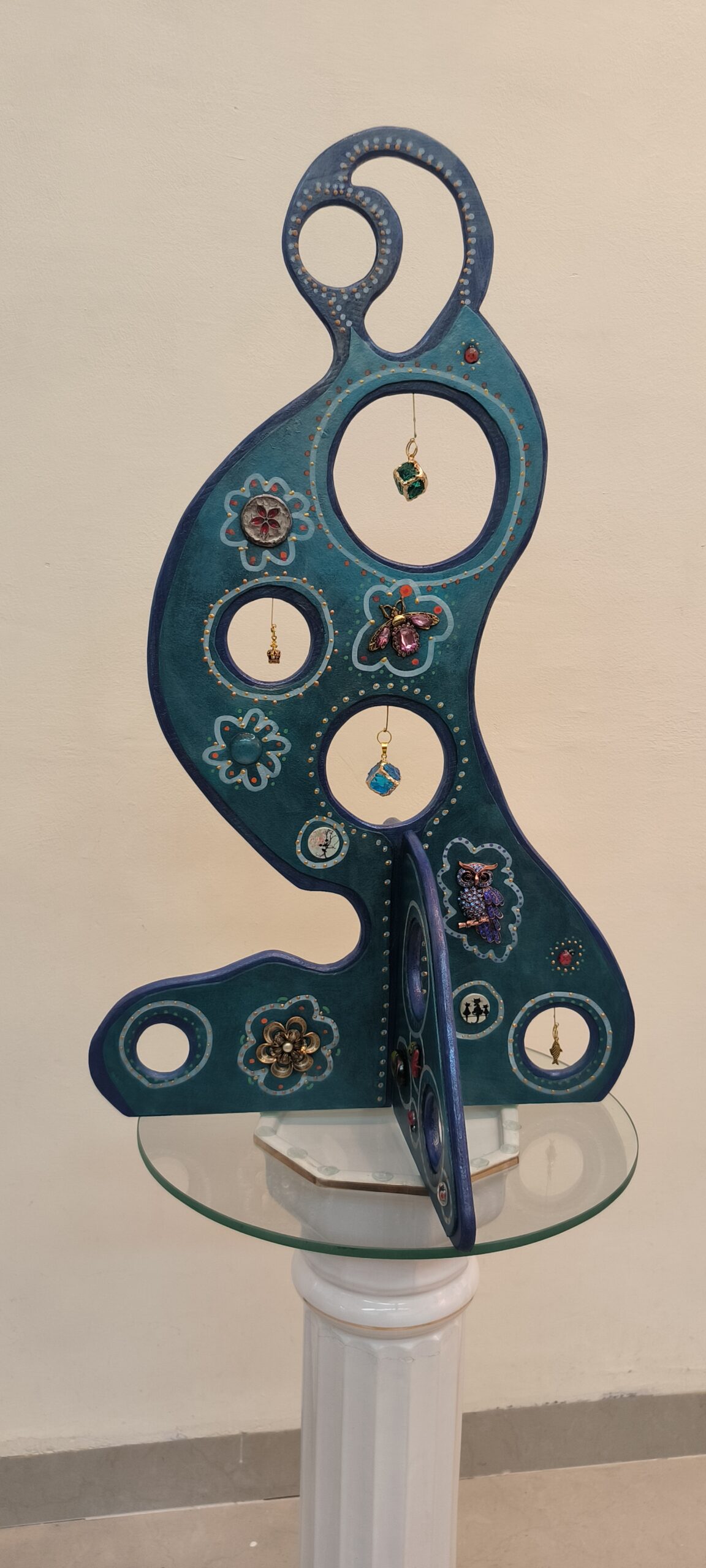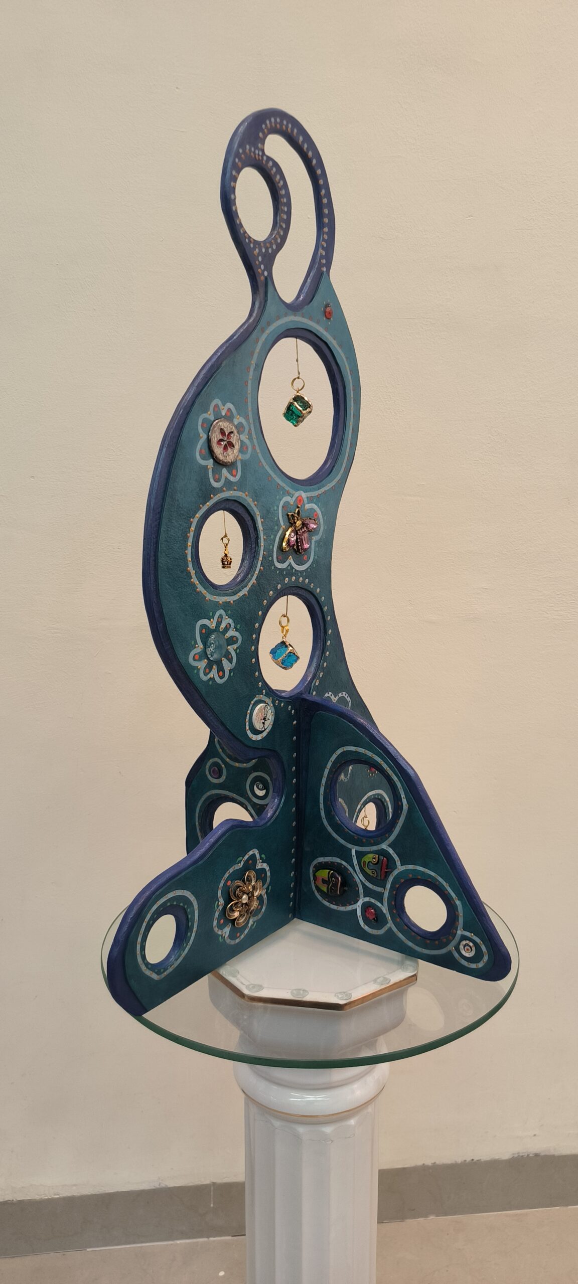 הפסל מתרגם את רוחם של האינוק לחומרים וצבעוניות אישית: צורת אדם ניצבת, הצבועה בטורקיז עמוק, שומרת על עקרון שיווי המשקל המהותי. החללים העגולים שבפסל פותחים צהר לצופה להתבוננות בעולם שמעבר.
