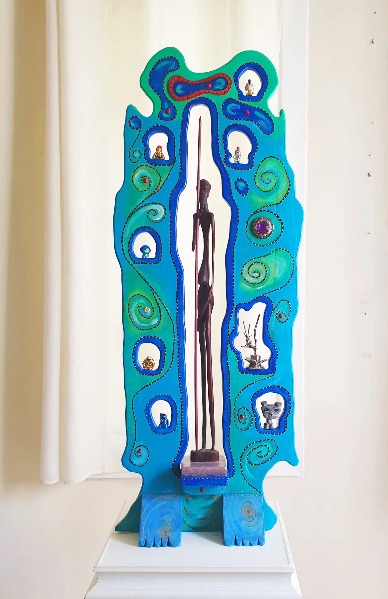 The sculpture is made of wood, painted with acrylics, and inlaid with “found objects” — small fragments that carry memory, humor, and the spirit of life.