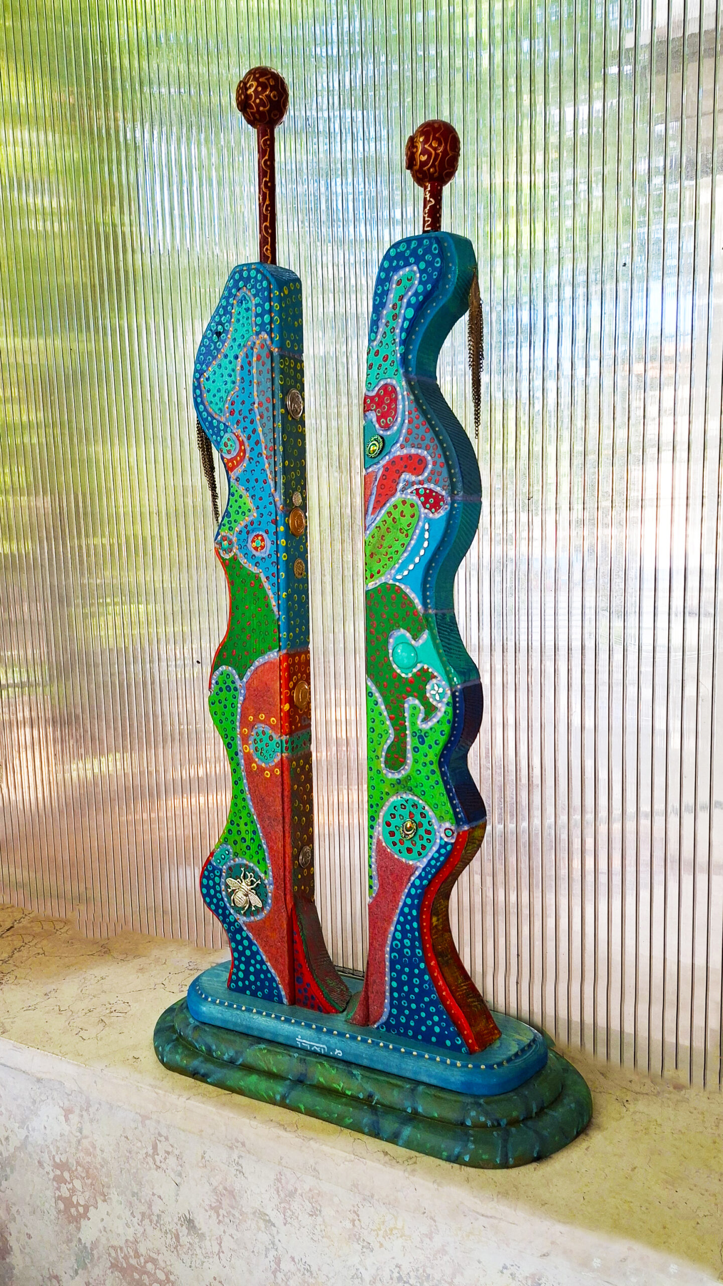 Like the other totems in the series, it is made of wood, painted with acrylics, and adorned with small found objects — fragments of memory and hope, traces of a bond-built day by day.