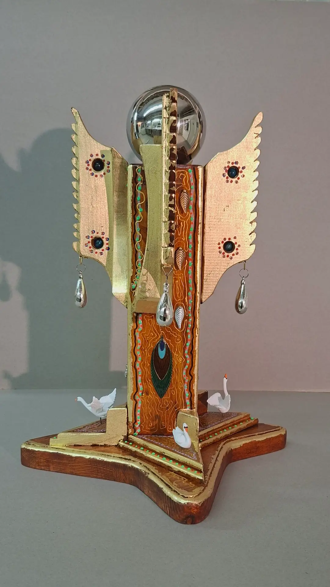ראשו של המלאך, כדור כסוף חלק ומבריק, אינו מחובר לגוף אלא מונח בעדינות בראש הטוטם. הוא נע בחופשיות ומגיב לכל תנועה קלה של האדמה, ובכך מבטא עדינות ודינמיות בתוך המבנה המסיבי. "מלאך מקורקע" הוא יצירה המבקשת לאזן בין כובד האדמה לשמימיות הזהב והזכוכית, ומזכירה לנו שגם למלאכים יש זיכרונות שהם נושאים עימם בדרכם.