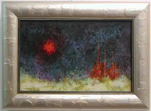 מסגרת לציור אקרילי- מצאנו רקע דומה לרקע עליו הציור ופס כהה יותר ש"נותן" פוקוס ליצירה.